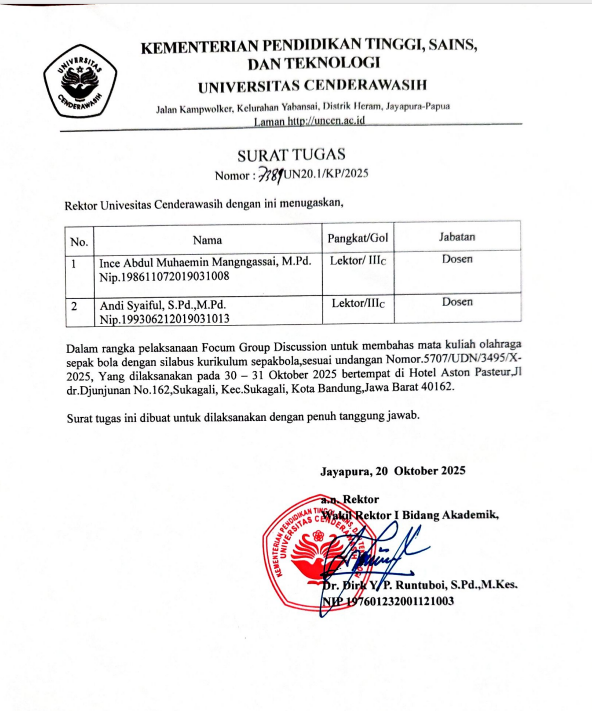 JAYAPURA – Program Studi Pendidikan Jasmani, Kesehatan, dan Rekreasi (Penjaskesrek) Universitas Cenderawasih (Uncen) terus berkomitmen dalam memperbarui dan meningkatkan mutu pembelajarannya. Dalam upaya tersebut, Andi Syaiful,S.Pd.,M.Pd dan Ince Abdul Muhaemin,S.Pd.,M.Pd dari Prodi Penjaskesrek telah berpartisipasi aktif dalam kegiatan Focus Group Discussion (FGD) penting di Bandung.