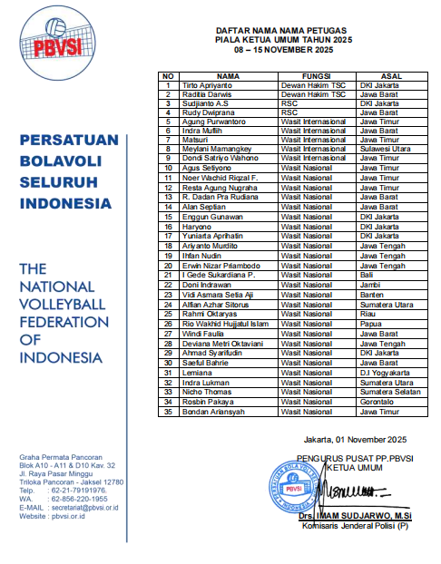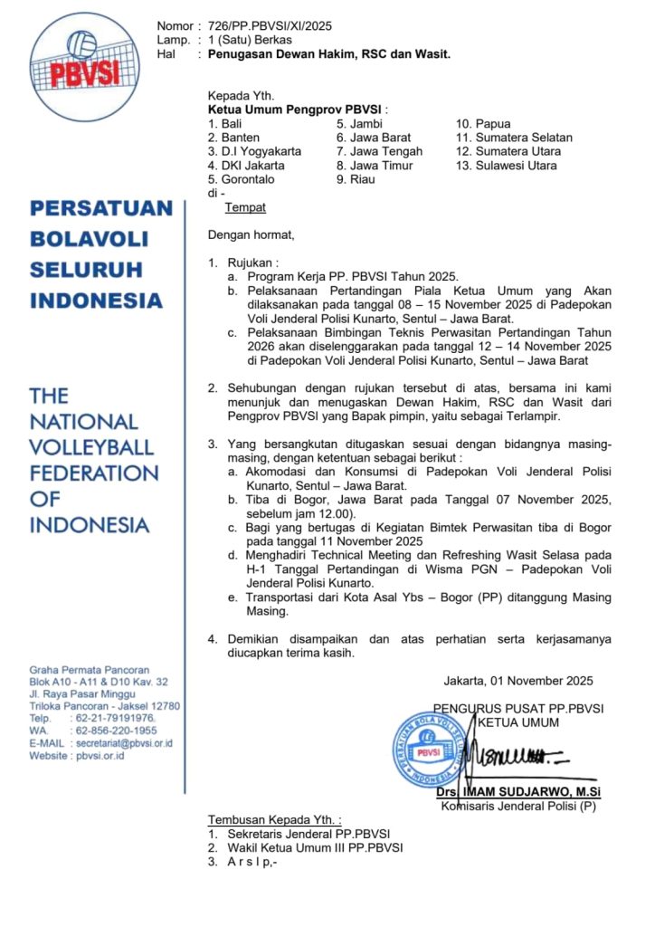 Turnamen Bola Voli Piala Ketua Umum PBVSI 2025 sendiri menjadi ajang strategis dalam memajukan kualitas kompetisi bola voli nasional. Dengan keterlibatan wasit dari berbagai daerah, termasuk dari Universitas Cenderawasih, turnamen ini sekaligus menjadi wadah pembinaan dan peningkatan standar perwasitan di Indonesia. Kejuaraan yang disiarkan secara Langsung di TV Nasional Yaitu Moji TV Berlangsung dari 8 – 15 November 2025.